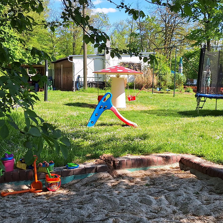 Für die kleinen Gäste gibt es eine Spielwiese, Planschbecken, Sandkasten und Schaukeln. Gerne könnt ihr noch